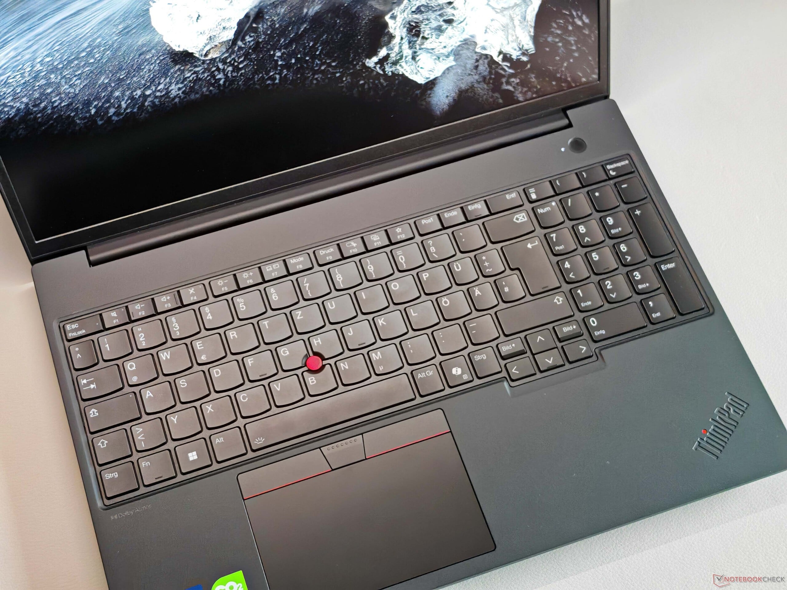 包括数字键盘在内的背光键盘也达到了当前 ThinkPad 的标准,尽管在当前的产品系列中还有更好的型号(例如 ThinkPad P1 16 G8).总的来说,我们认为打字感觉舒适而精确,但竞争对手至少也能做到这一点。由于采用了专用的 TrackPoint 按钮,ClickPad(11.5 x 6.7 厘米/~4.5 x ~2.6 英寸)按现代标准来看相当小,但操作性极佳,下部区域的机械点击也非常优质。TrackPoint 按钮也是如此。
