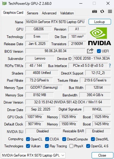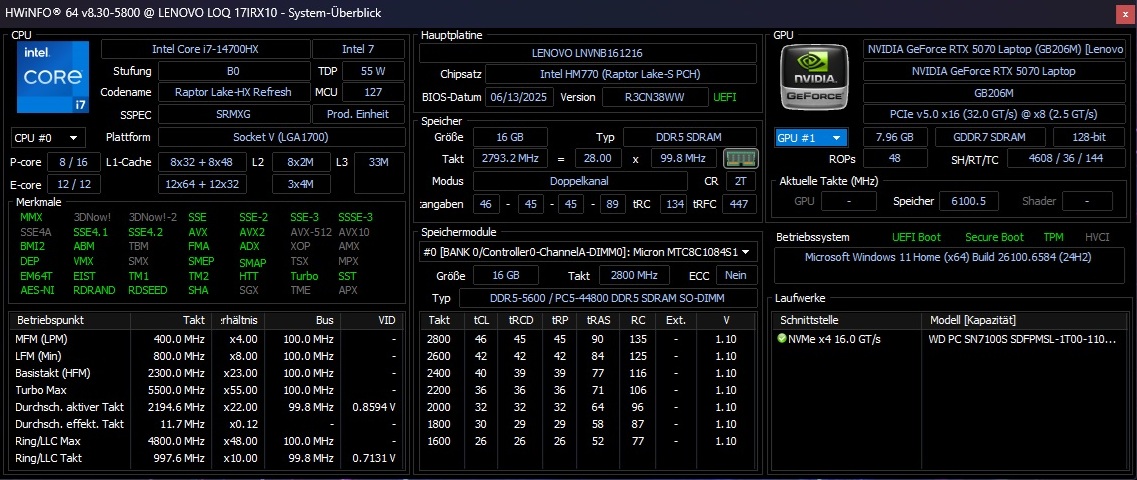 因此,我们不能像某些竞争对手那样对它寄予厚望,但联想还是做得不错的--虽然有一两处不足之处。显卡的良好性能尤其值得称赞。得益于内置的 GPU 超频功能,RTX 5070 的性能高于平均水平。在积极的一面,我们还拥有两个内存和固态硬盘插槽用于未来升级、相对较好的输入设备和防污表面。