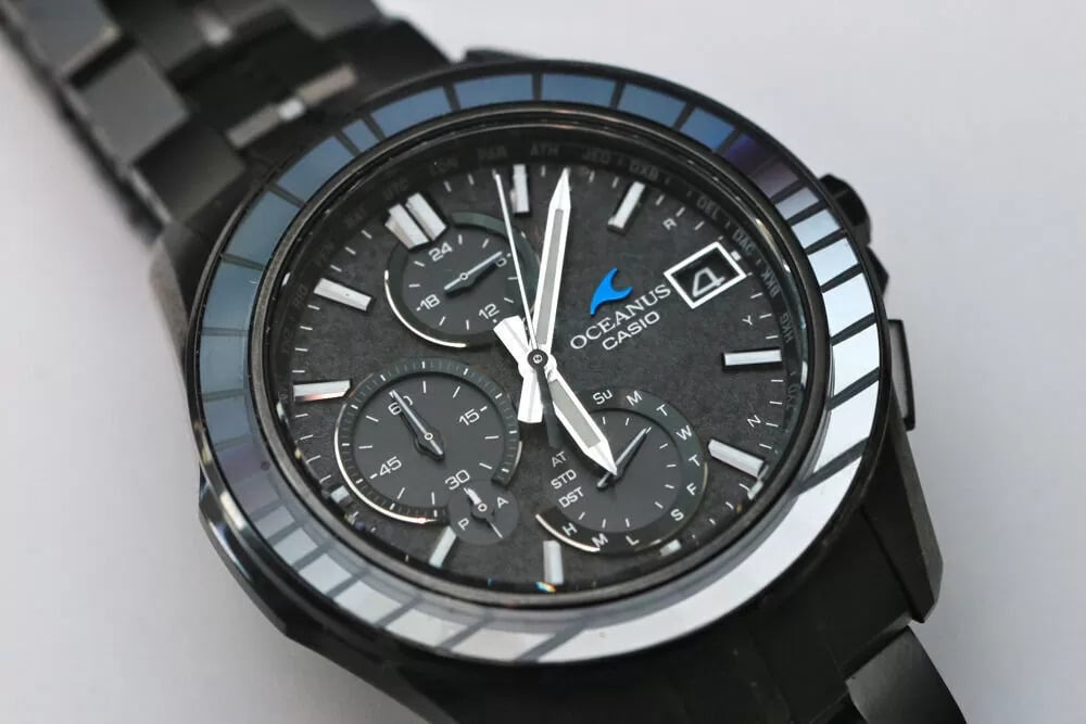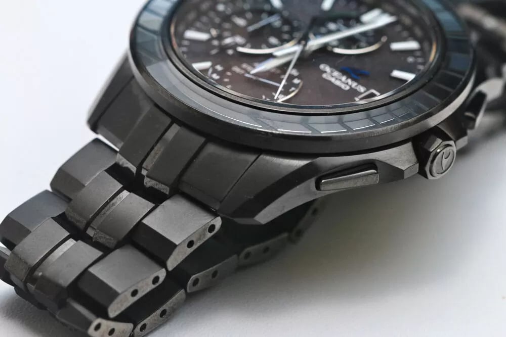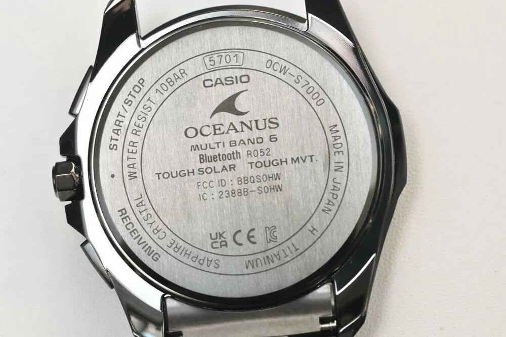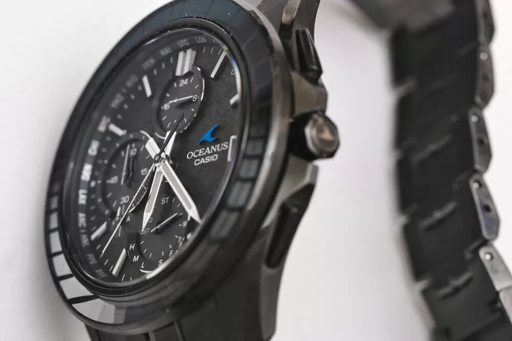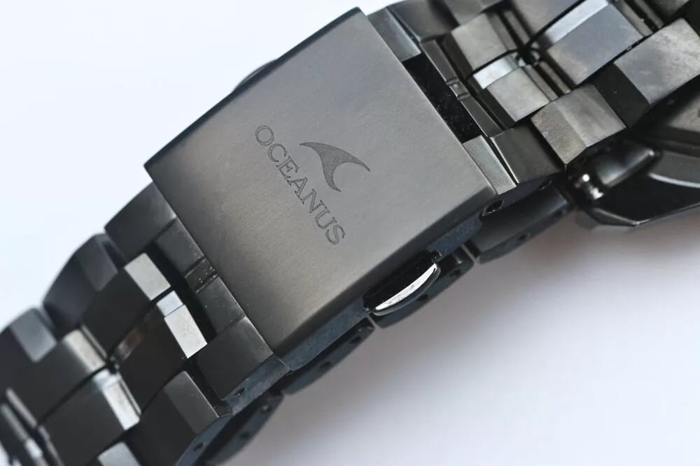 侧面照片显示,从功能列表来看,表壳相对纤薄,表耳形状看起来佩戴舒适。按钮和表冠棱角分明,表冠上镌刻有 Oceanus 标志。表背显示了蓝牙、Multiband 6 无线电同步、Tough Solar、蓝宝石水晶和 10 bar 防水功能。