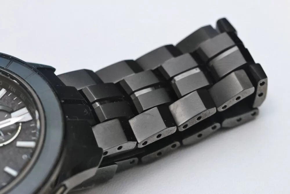 首先映入眼帘的是表壳和表链。这款手表似乎采用了黑色 DLC 表面处理的全钛金属结构,特写显示出比往常更锋利的边缘和更复杂的加工工艺。表链链节有明显的棱角切面,刷纹看起来很深,而不是轻轻涂抹上去的。表扣上镌刻的遨享仕标识也十分精美,哑光质感与周围的反光抛光相得益彰。
