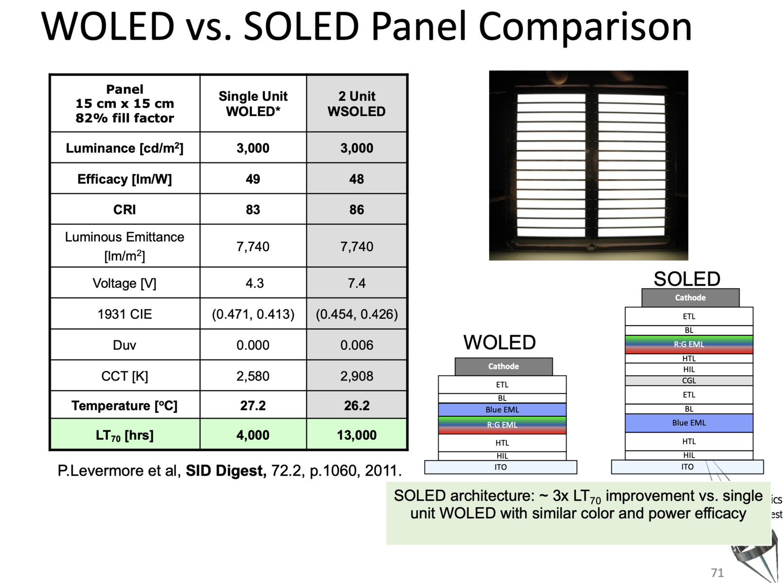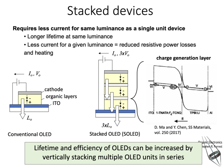 所以耐久性,特别是蓝色OLED的耐久性,仍然是一个问题。但现在有越来越多的技巧来拉伸它们。例如,一个解决方案,,就是垂直堆叠(透明)OLED组件 。这将负荷分散到更多的组件上。当使用两个堆叠的组件时,耐用性可以增加三倍以上。据这两位研究人员说,研究已经进行了几十年,但直到现在,这项技术才慢慢成为现实。
