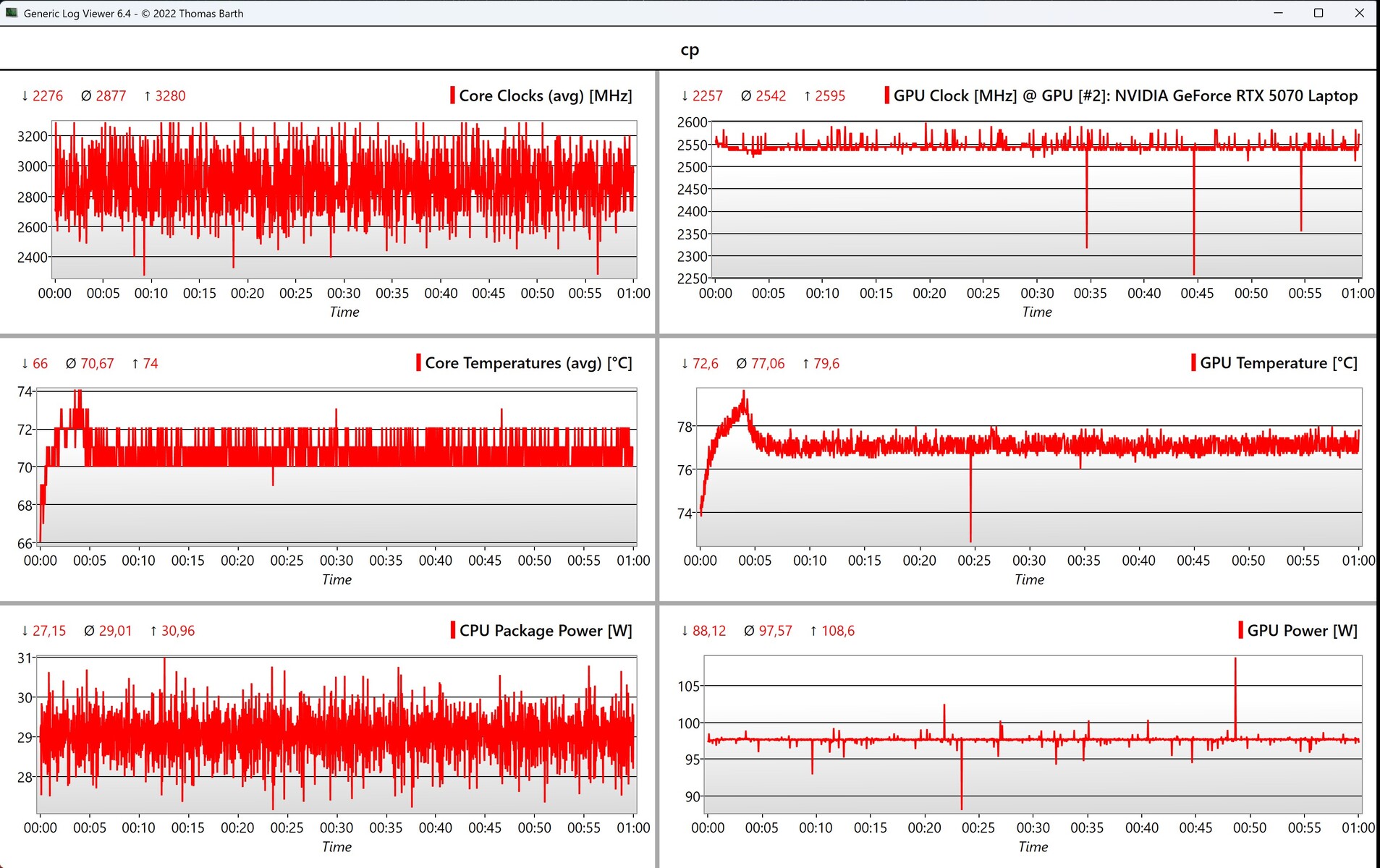 与 Core Ultra 7 255H 相比,可选的 Core Ultra 9 285H 实际上并不值得购买,因为在单核场景下只有非常微弱的优势。移动版GeForce RTX 5070 比 RTX 5060 快约 10-15%,如果你想要最高的 GPU 性能,它可以为你带来回报。不过,我们也发现这里错失了安装更快 GPU 的机会。华硕即将推出 ProArt P16的更快版本(最高 RTX 5090 笔记本电脑,也是串联 OLED),届时可能会轻松摘得多媒体笔记本电脑领域的性能桂冠。