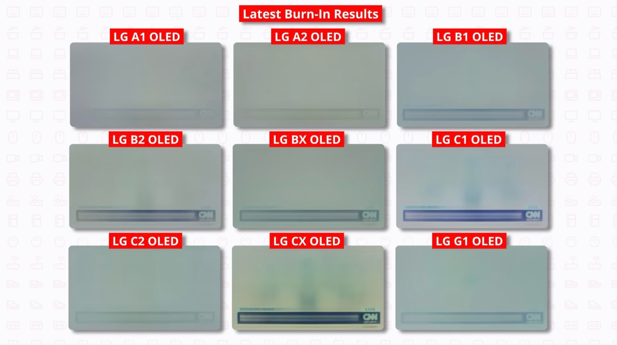 Rtings将 102 台电视机在最大亮度下运行了 3 年,通过显示一个新闻频道,该频道底部不断显示出一个新闻快讯条,以测试烧毁情况。不出所料,烧毁仍然是一个问题,但液晶显示器在使用 18000 小时后也出现了严重问题。