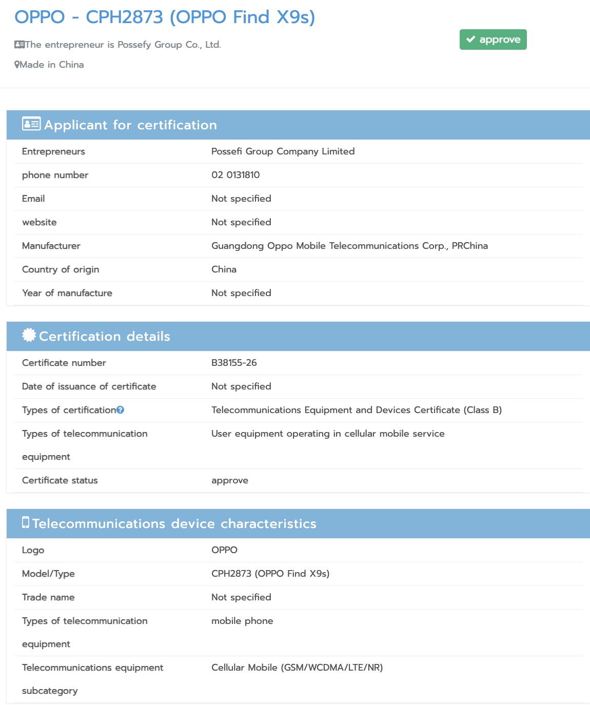 值得注意的是 OPPOFind X9s 型号为 "CPH2873",最近通过了泰国 NBTC 监管机构的认证。这暗示着 Find X9s 可能会在全球范围内上市,这与 Find X8s仅限于中国市场。