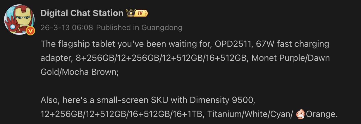其中一款是 平板电脑型号为 "OPD2511"。不过,泄露的信息并未透露该设备的确切名称。爆料者透露,该设备将有四种内存配置:8GB/256GB、12GB/256GB、12GB/512GB 和 16GB/512GB。据说这款即将推出的 OPPO 旗舰平板电脑将有莫奈紫、黎明金和摩卡棕三种配色。泄露的信息还暗示将支持 67W 快速充电。