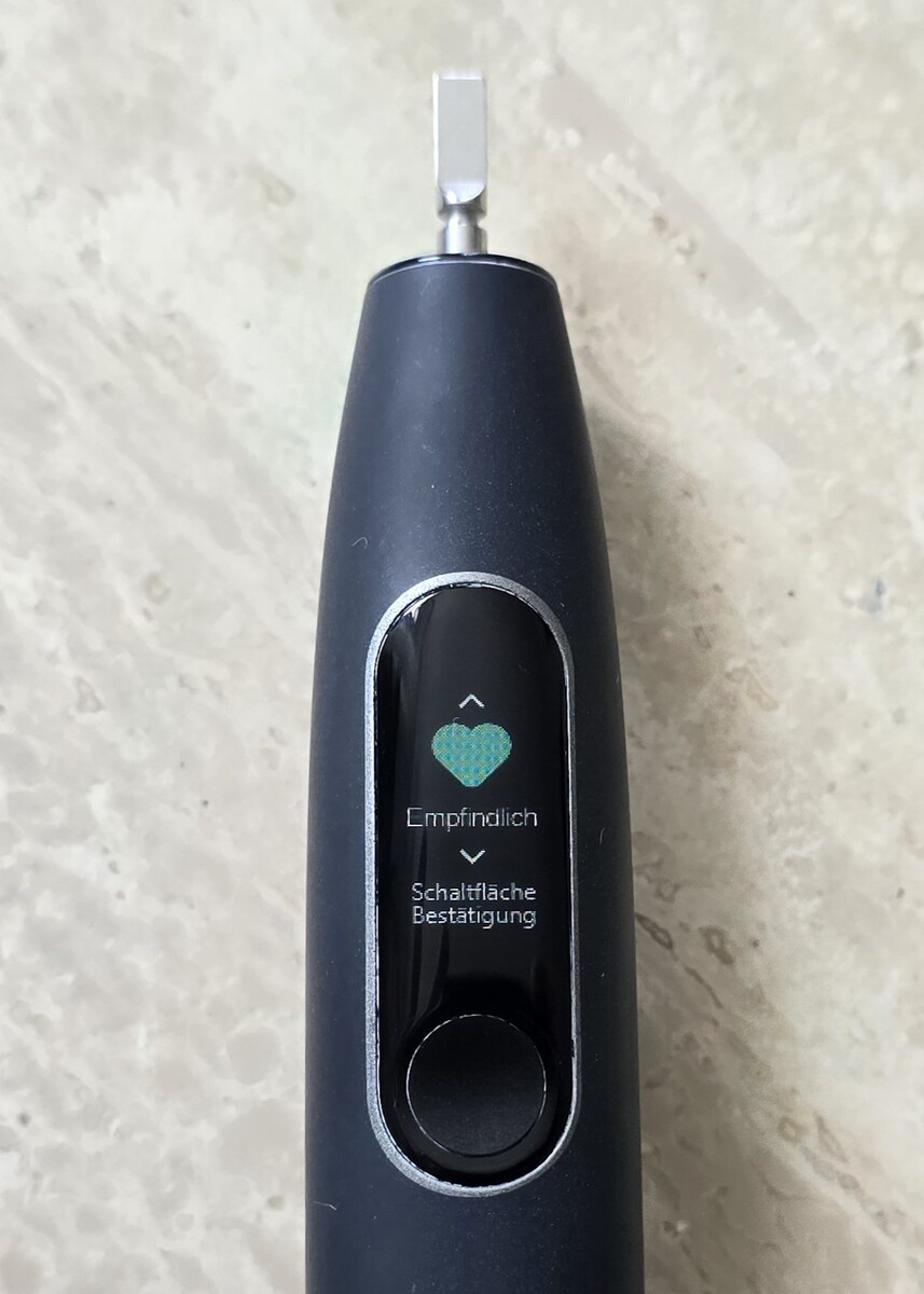X Pro Elite 通过按钮和触摸式彩色显示屏进行操作,显示屏可显示程序、持续时间和刷牙强度。在我们的测试中,触摸屏的反应比 X Ultra S 好,不过偶尔会出现中断,这意味着必须重复轻扫手势。