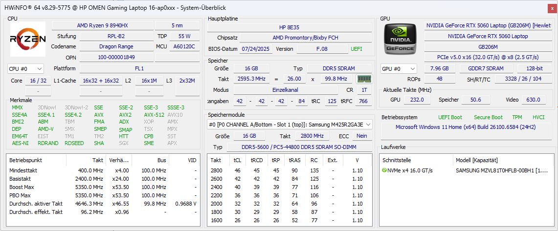 HP Omen 16-ap0091ng GeForce RTX 5060 Laptop, R9 8940HX, Samsung PM9C1b MZVL81T0HFLB-00BH1 | HP Omen 16 (2024) NVIDIA GeForce RTX 4080 Laptop GPU, i9-14900HX, SK hynix PC801 HFS001TEJ9X101N | Lenovo Legion 5 15AHP G10 GeForce RTX 5060 Laptop, R7 260, SK hynix PVC10 HFS001TEM4X182N | SCHENKER XMG Core 15 (M25) GeForce RTX 5060 Laptop, Ryzen AI 7 350, Samsung 990 Pro 2 TB MZVL72T0HDLB | Lenovo LOQ 15AHP10 GeForce RTX 5060 Laptop, R7 250, Micron 2500 1TB MTFDKBA1T0QGN | Alienware 16 Aurora GeForce RTX 5060 Laptop, Core 7 240H | |