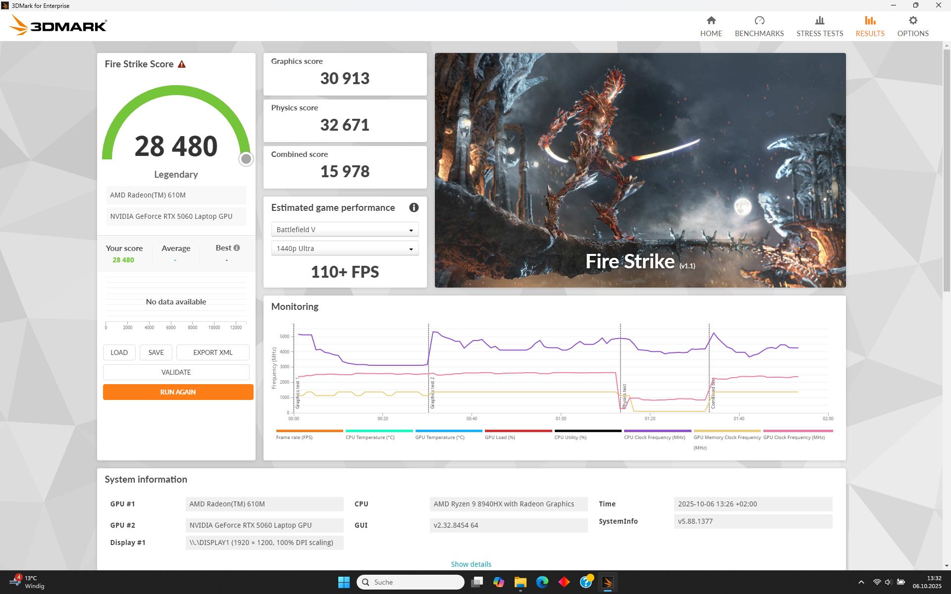HP Omen 16-ap0091ng R9 8940HX, GeForce RTX 5060 Laptop, 70 Wh | HP Omen 16 (2024) i9-14900HX, NVIDIA GeForce RTX 4080 Laptop GPU, 83 Wh | Lenovo Legion 5 15AHP G10 R7 260, GeForce RTX 5060 Laptop, 80 Wh | SCHENKER XMG Core 15 (M25) Ryzen AI 7 350, GeForce RTX 5060 Laptop, 99.8 Wh | Lenovo LOQ 15AHP10 R7 250, GeForce RTX 5060 Laptop, 60 Wh | Alienware 16 Aurora Core 7 240H, GeForce RTX 5060 Laptop, 96 Wh | Average of class Gaming | |