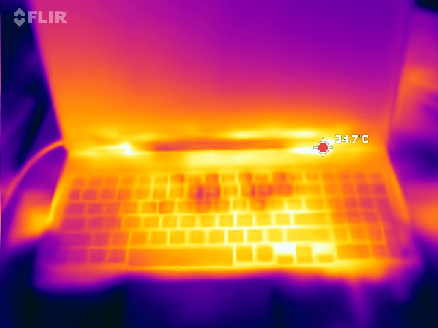 (+) In idle usage, the average temperature for the upper side is 27.7 °C / 82 F, compared to the device average of 33.9 °C / 93 F.