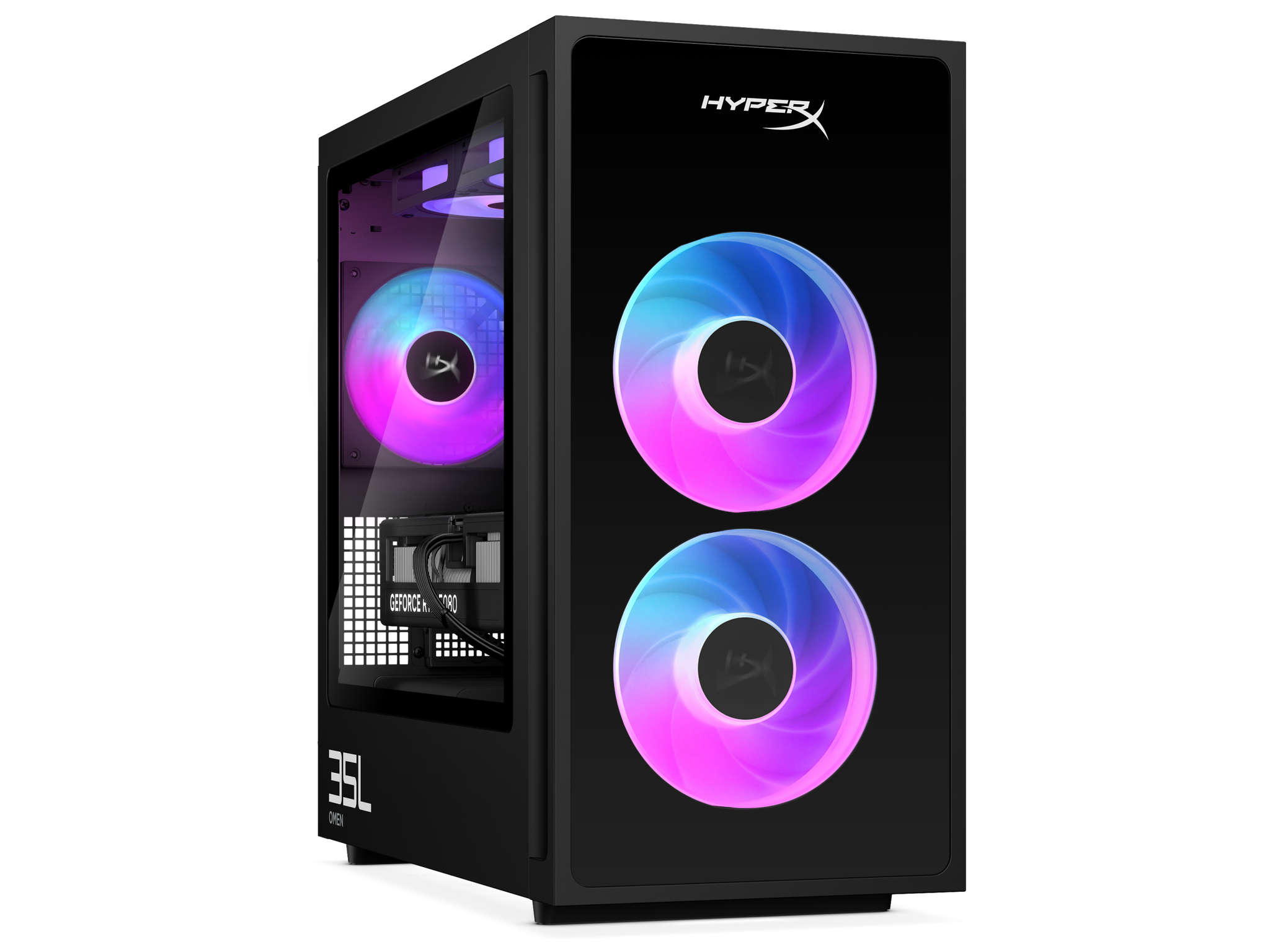 遗憾的是,Omen 35L 不能配置 SATA 硬盘。不过,可以选配 2 TB PCIe Gen 5 固态硬盘和 2 TB PCIe Gen4 固态硬盘。惠普通过 120 毫米风扇保持系统冷却:前面两个,后面一个,顶部两个。没错,还有 RGB。