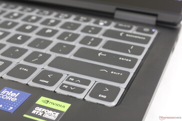 该机型采用了无格子键盘设计,与大多数其他笔记本电脑的chiclet 键盘形成鲜明对比。这种设计使按键的尺寸更大,周围的半透明度更高,从而在背光激活时最大限度地实现 RGB 效果。诚然,这是一个令人满意的视觉变化,有助于将 Omen Transcend 14 与竞争对手甚至其他 Omen 游戏笔记本电脑区分开来。