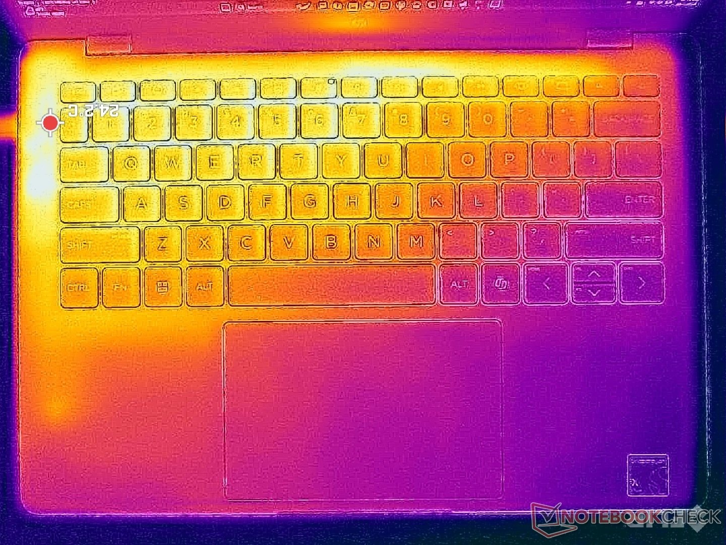 (+) The maximum temperature on the upper side is 32.4 °C / 90 F, compared to the average of 35.9 °C / 97 F, ranging from 21.4 to 59 °C for the class Subnotebook.