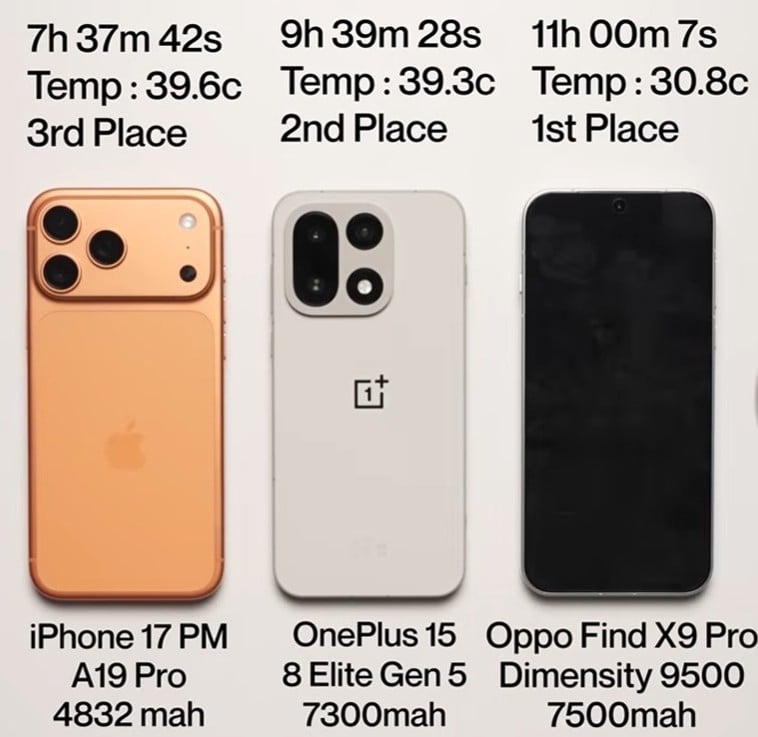 然而 OPPOFind X9 Pro 的电池容量仅为 7,500mAh 稍大一些,但仍以 11 个小时的屏幕续航时间在续航排行榜上保持着无可争议的领先地位。iPhone 17 Pro Max 通常因其稳定的电池续航时间而备受赞誉,但在同一测试中却达到了 7 小时 37 分 42 秒。在 YouTuber 之前的测试中,Oppo 和 iPhone 的测试结果保持一致,这证明了测试方法的可靠性。