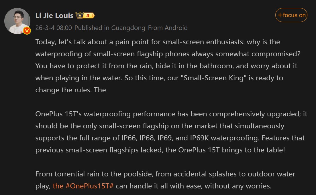 OnePlus 15T 预告显示更强的防水等级,并暗示最终设计