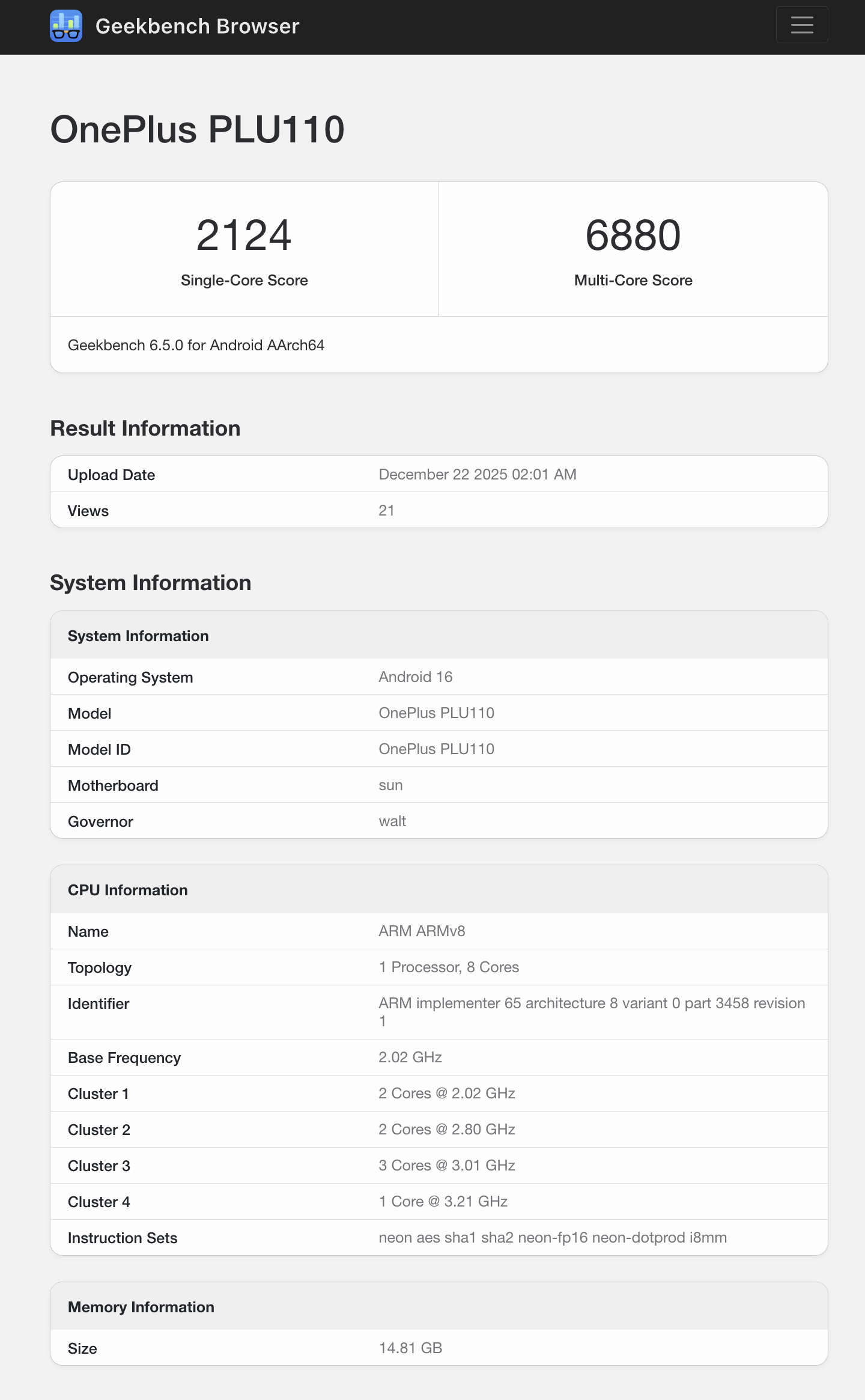 OnePlus 正式 确认了上周,OnePlus 正式确认了其全新 Turbo 智能手机系列的存在。虽然该公司一直 的之后,新的 Geekbench 条目似乎提前透露了各种细节。正如下面的截图所示,一款型号为 PLU110 的未发布 OnePlus 智能手机现在出现在了这个流行的基准测试平台上。
