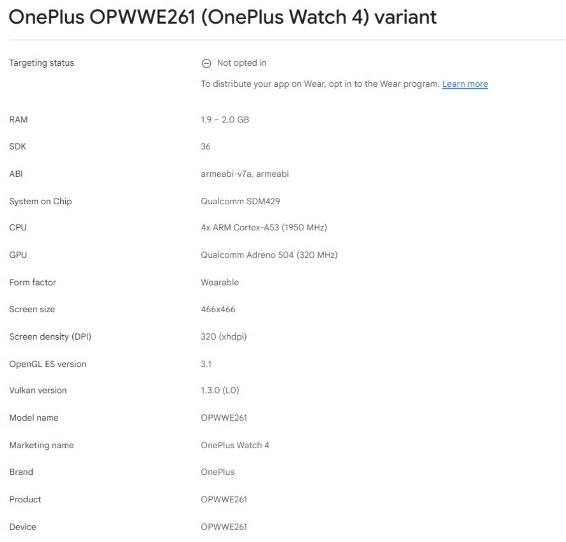 遗憾的是 之前的说法OnePlus 从旧款 Watch 3 移植了硬件。 手表 3亚马逊售价 249.99 美元)的说法是准确的。例如,Google Play 控制台显示,Watch 4 配备了 2GB RAM 和高通公司的 骁龙 W5 第一代芯片组,而不是更新的 骁龙 Wear Elite.
