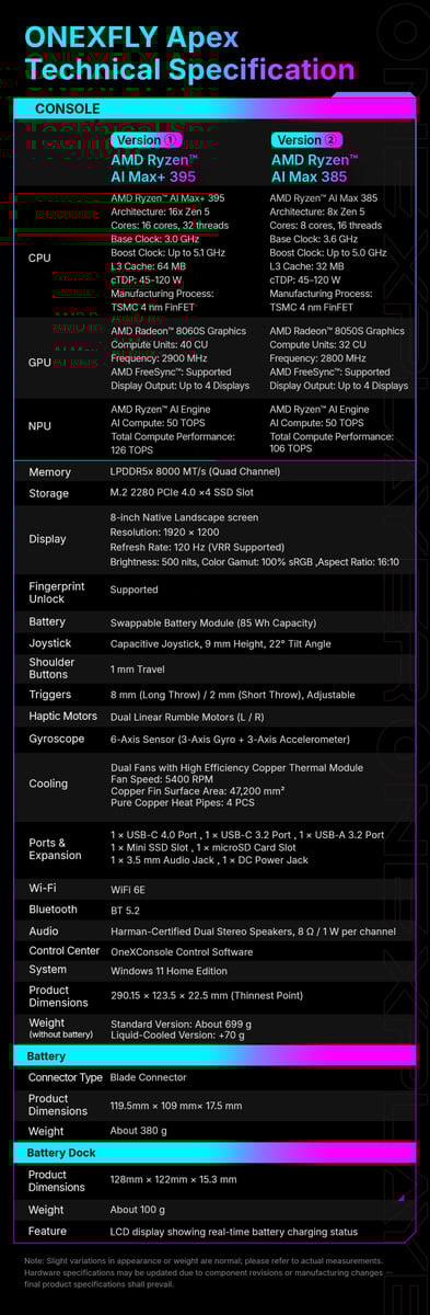 不仅如此,One-Netbook 还确认了 OneXFly Apex 的上市价格。以下是 GPD Win 5在同一众筹平台上的售价为 1448 美元,配备了 Ryzen AI Max 385APU 、32 GB 内存和 1 TB 存储空间。同时,更强大的 Ryzen AI Max+ 395变体的起价为 1650 美元,配备 32 GB 内存和 2 TB 存储空间。