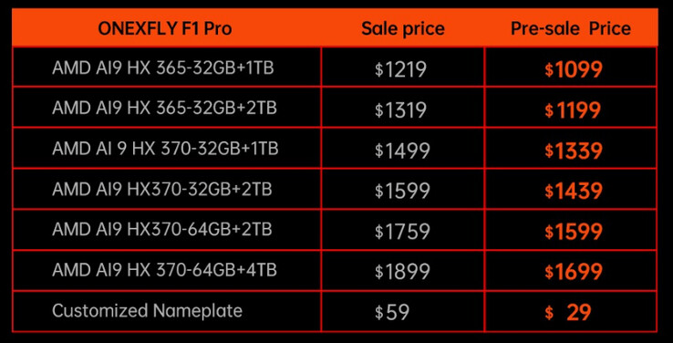 OneXFly F1 Pro 的起价为 1099 美元,配备 Ryzen AI 9 365、32 GB 内存和 1 TB 存储空间。另外,该设备还可配置两倍的存储空间,但需额外支付 100 美元。与此同时,Ryzen AI 9 HX 370 SKU 的价格至少为 1,339 美元,但如果配置 64 GB 内存和 4 TB 存储空间,价格将升至 1,699 美元。请注意,所有这些都是预售价格,应于 11 月底开始发货。完整定价请参见下文。