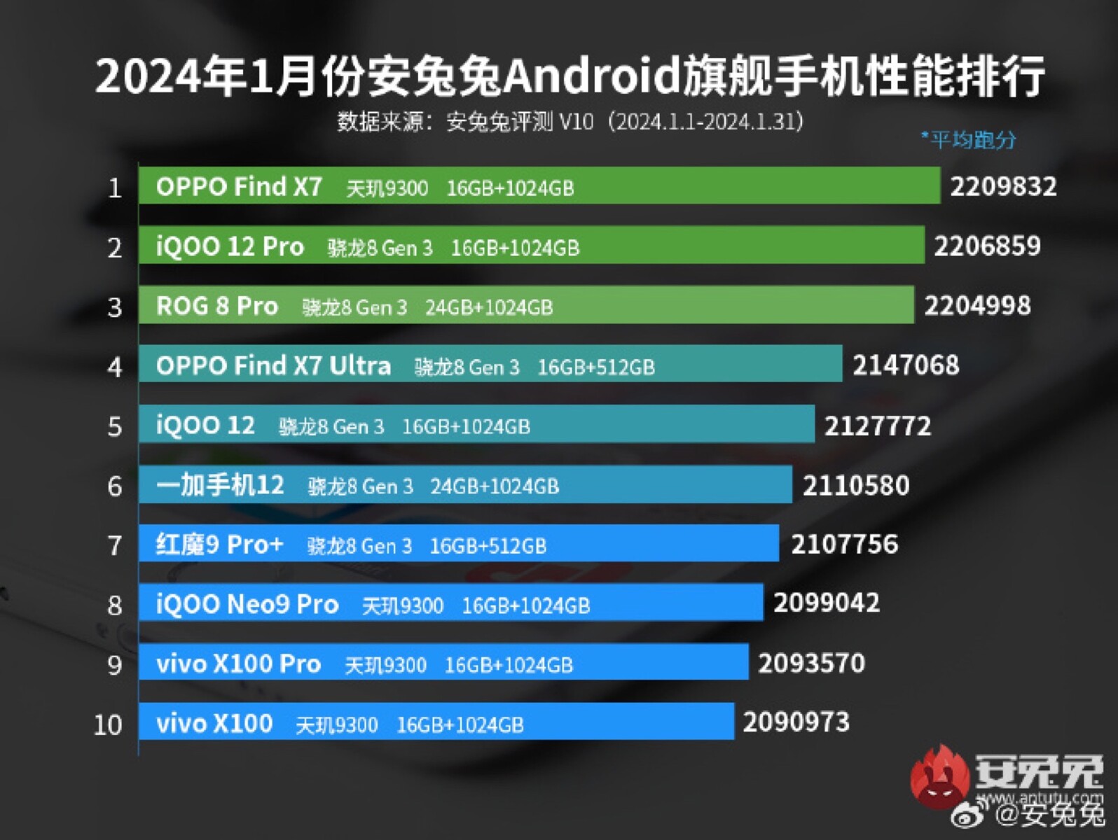 高通公司(Qualcomm)在安兔兔性能排行榜上的统治地位已经结束,至少目前是这样,因为基于联发科 Dimensity 9300 的 Oppo Find X7超过了 iQOO 12 Pro 和华硕 ROG Phone 8 Pro,这两款手机都配备了 高通骁龙 8 代 3.