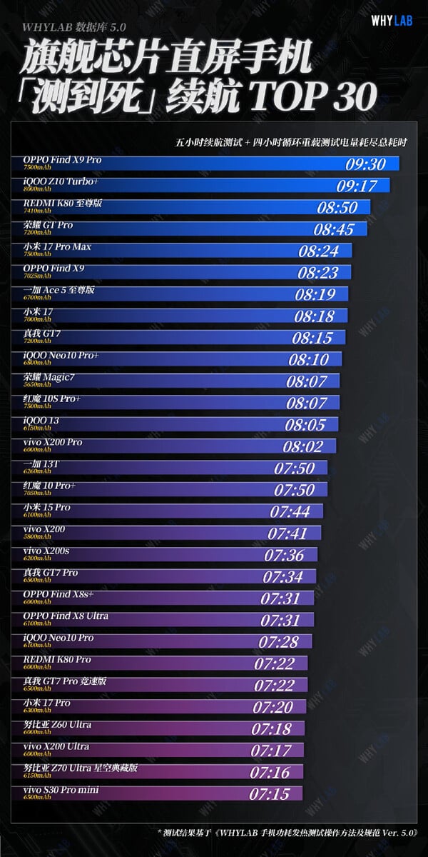 WhyLab 进行的一系列类似测试也得出了相同的结果。Find X9 Pro 的总耗时为 9 小时 30 分钟,而小米 17 Pro Max 的总耗时仅为 8 小时 24 分钟。