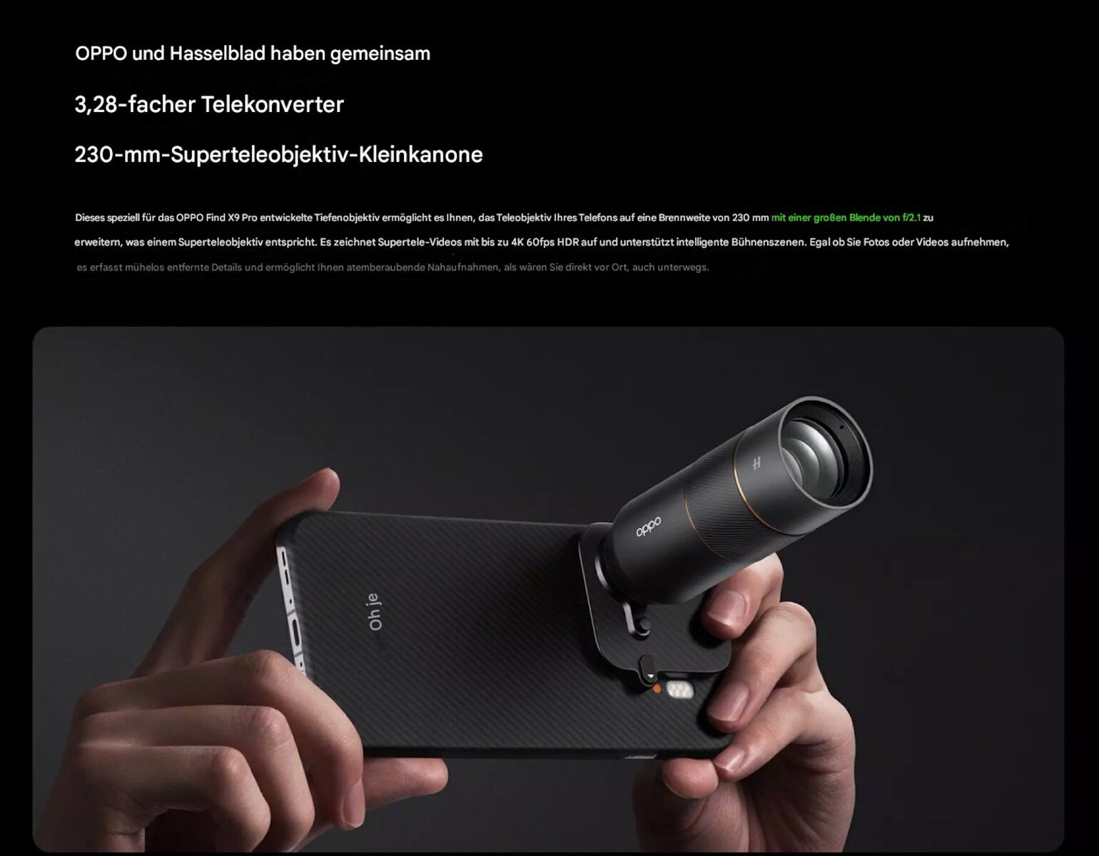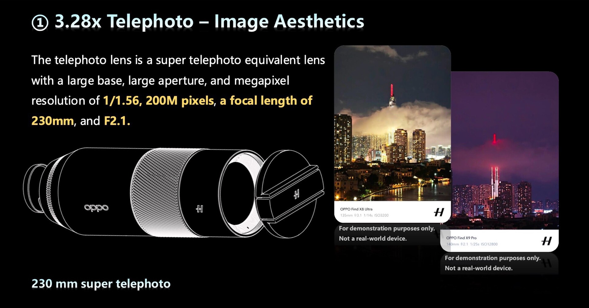 这款长焦相机的等效焦距为 35 毫米,焦距为 70 毫米,光圈为 f/2.1。对于那些希望获得更大拍摄范围的用户,Oppo 提供了一个可选的长焦转换器,可有效地将潜望镜长焦摄像头的焦距增加到 230 毫米(等效 35 毫米),使智能手机获得 10 倍光学变焦。