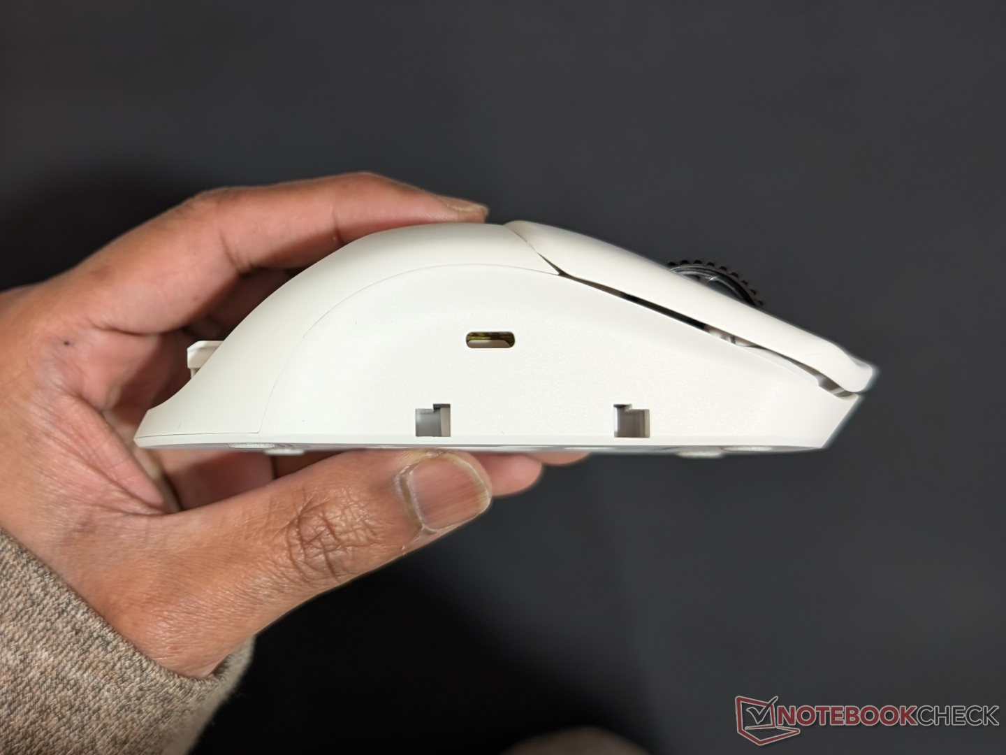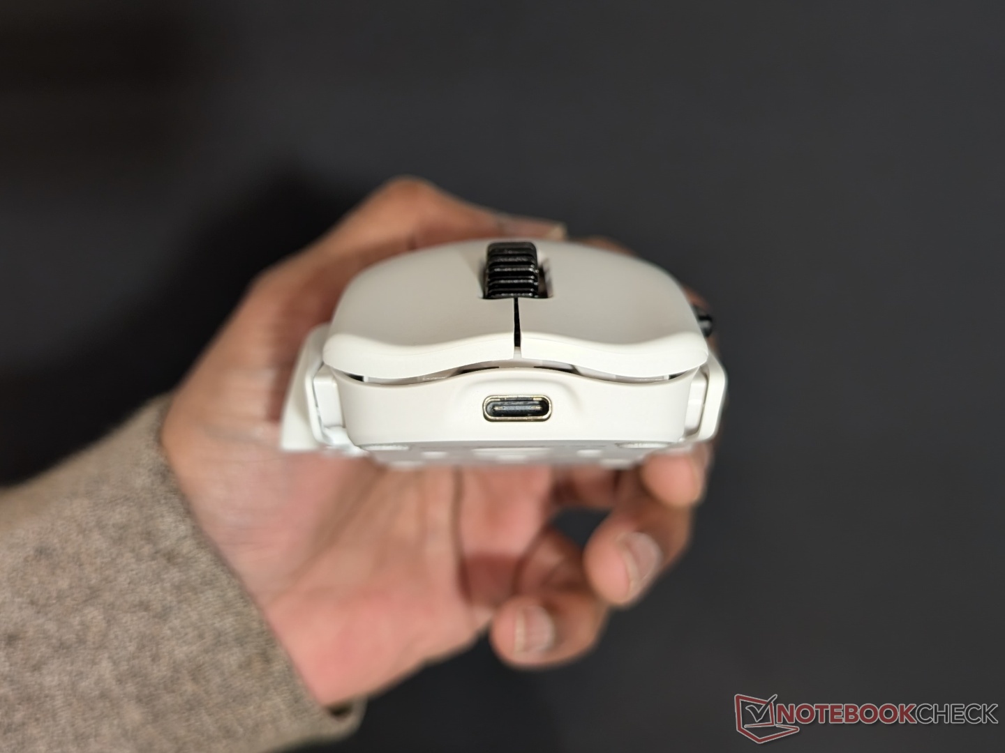 说到这一点,电池续航时间足够长,符合公司的要求。按照 Orbital 的说法,以 1,000 Hz 的轮询频率使用鼠标,可以轻松持续一周以上。在 8,000 Hz 和 4,000 Hz 模式下,300 毫安时的耗电速度更快,延迟也没有明显改善。即使是专业人士也坚持使用 1,000 Hz,这是有原因的。使用附带的 USB Type-C 线缆充电非常快,但倾斜的接头迫使你只能单向插入。在某种程度上,这可能是为了防止有线操作时线缆拖在桌面上。这种连接器确实可以让接收器更加稳固地放在桌面上,线缆自然地落在桌面后面。