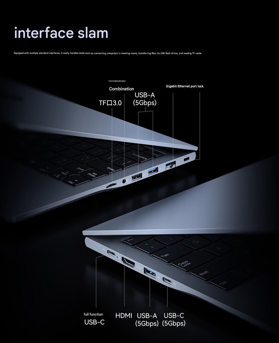 具体来说,它采用了端口丰富的设计,在笔记本的侧面共有 9 个输入/输出选项。Orico Obook 的端口配置如下: