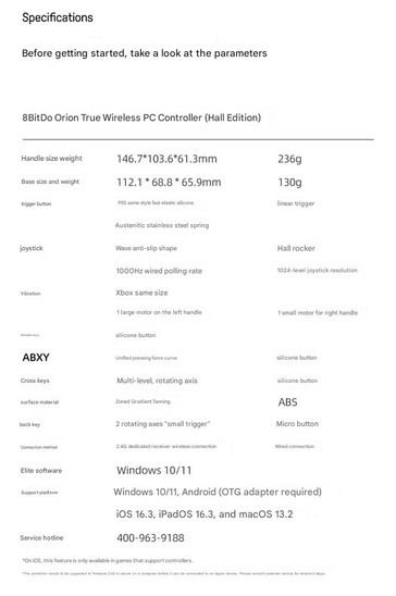 官方图片显示,Orion 和 Ultimate 在外形上完全相同,具有相同的控制布局和设计。比较 8BitDo 的规格发现,Orion 比 Ultimate 稍微小一些,重量也轻一些,分别为 146.7 x 103.6 x 61.3 毫米和 236 克,而 Ultimate 为 147.0 x 104.0 x 61.5 毫米和 245 克。