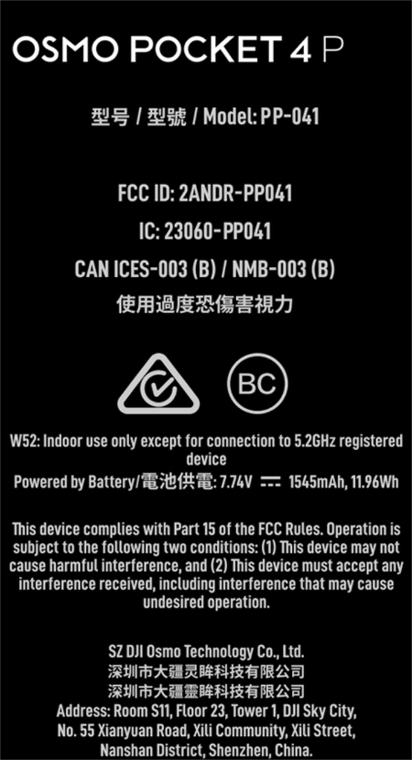 FCC 尚未透露 Osmo Pocket 4 Pro 的外观。相反,该监管机构同意在 2026 年 6 月底之前暂不公布任何照片。与此同时,FCC 已确认 Osmo Pocket 4 Pro 采用 1545 毫安时电池(7.7 V)。与 Osmo Pocket 3 的 1300 毫安时电池相比,这是一个相当大的升级。 Osmo Pocket 34 Pro 的电池容量与 Osmo Pocket 4 不相上下。尽管如此,FCC 的认证几乎确认了大疆将在全球发布 Osmo Pocket 4 Pro。