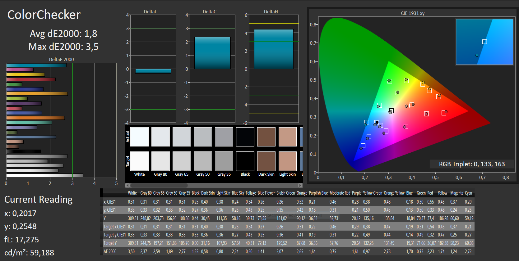 ΔE ColorChecker Calman: 1.8 | ∀{0.5-29.43 Ø4.78}