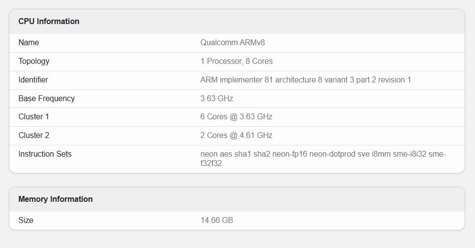 基准列表显示的另一个关键细节是内存配置。经测试,POCO F8 Ultra(25102PCBEG)配备了 16GB 内存。这一点很重要,因为最近泄露的信息显示,稍低级别的 POCO F8 Pro 在全球的内存上限为 12GB.看来,小米将额外的 4GB 内存作为 Ultra 机型的主要差异化因素,使其成为一个关键卖点。