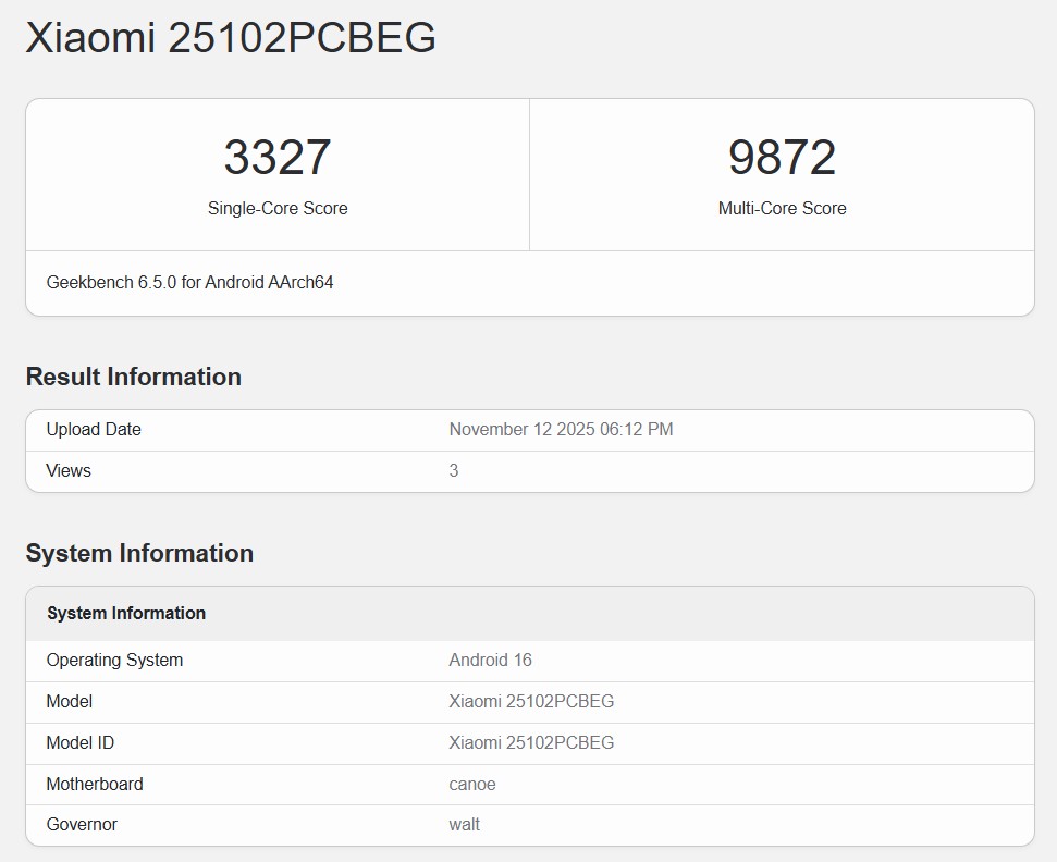 POCO F8 Ultra 出现在 Geekbench 6 数据库中,单核测试成绩为 3,327 分,多核测试成绩为 9,872 分。细究细节,主板代号 "独木舟 "和 CPU 时钟速度(两个主频 4.61GHz,其余六个主频 3.63GHz)证实了该设备将拥有强大的 骁龙 8 精英 5 代芯片.