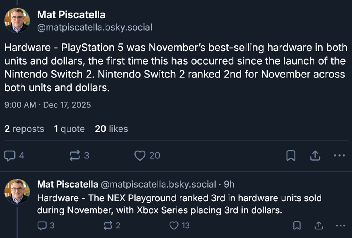 斯维奇 2 Switch 2任天堂的零售业绩超出预期。尽管如此,索尼的游戏系统仍然表现出了顽强的生命力,在PS5 的销量在 11 月的 Circana 排行榜上名列前茅。美国数据显示美国的数据显示,PlayStation 游戏机自其掌上游戏机发布以来首次位居榜首。