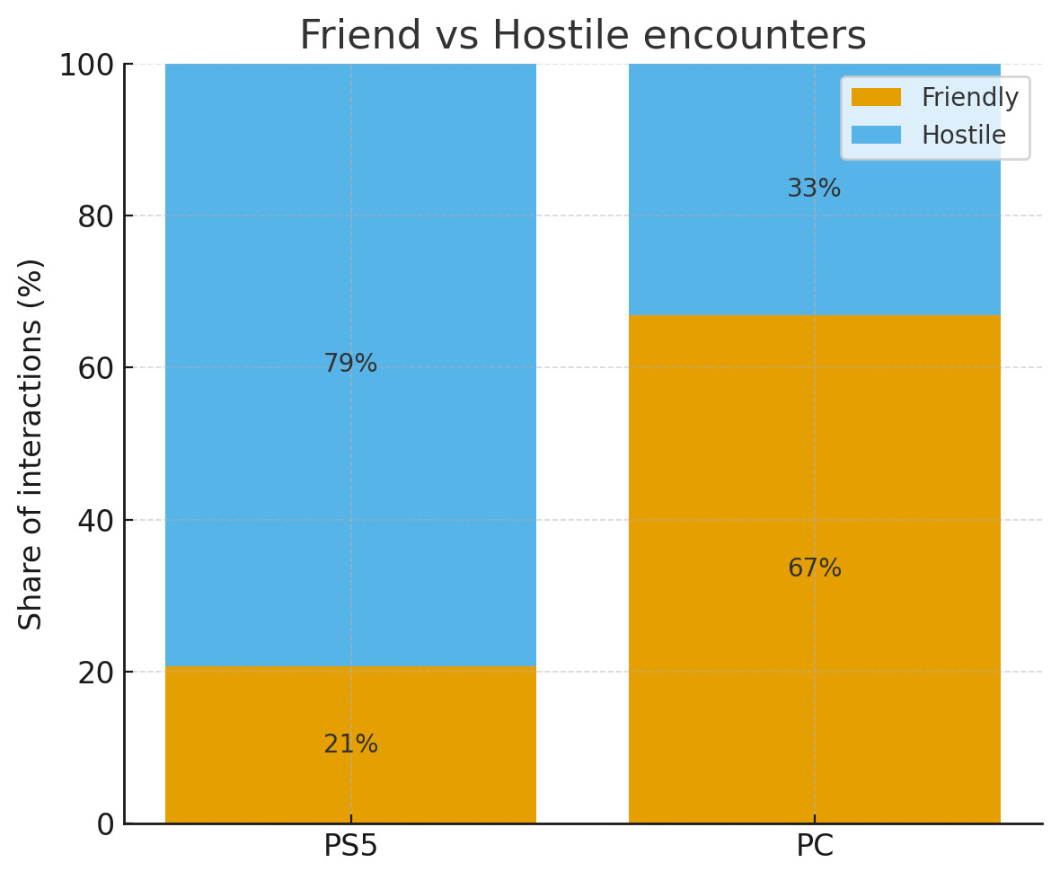 根据他们的数据编制的图表(见下图)(感谢u/Scared-Computer502)使这种对比更加明显。一言以蔽之,PC 玩家表现出更高比例的友好或合作行为,而 PS5 玩家的遭遇则导致更多的背刺和即时敌对行为。请注意,样本量仍然很小,而且仅限于两名玩家和一周的游戏时间,但这两种体验之间的差距足够大,因此双方都认为值得分享。至少对这两位玩家来说,《Arc Raiders》给他们的感觉是两个不同的游戏,这取决于他们在哪里玩。