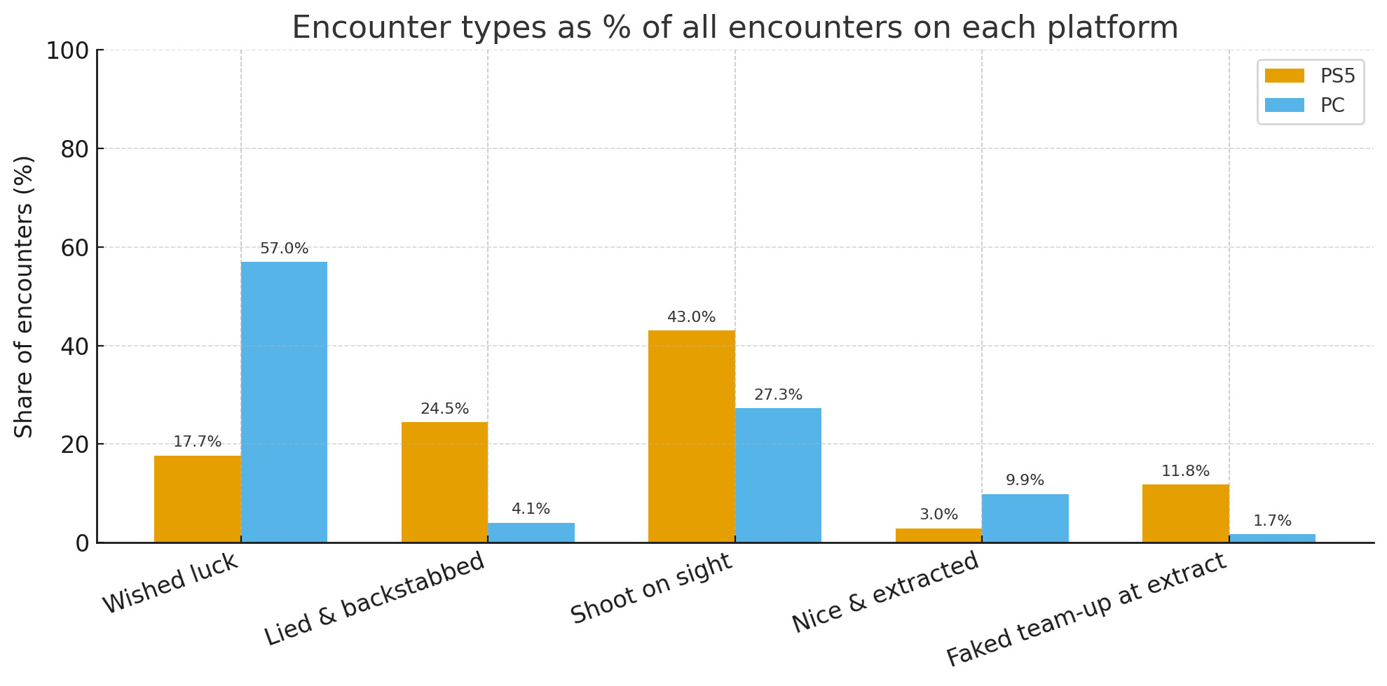PC 方的情况则截然不同。在 51 个回合和 172 次遭遇战中,友好互动的数量几乎翻了一番。98 名玩家祝 PC 用户好运,17 名玩家在撤离过程中保持友好。虽然敌意的遭遇战并没有消失--47 名玩家仍然当场开枪,7 名玩家在攻击前撒了谎--但敌意互动的总体比例仍然低于 PS5 上的记录。这对兄弟还提到,在 PC 上,他们尝试进行交流--交谈、交易物品或建议短时间组队--得到的回应要开放得多。在 PS5 上,这位兄弟说他最终转向了一种更安静、更谨慎的游戏方式,因为几乎每次遭遇都会引发直接冲突。