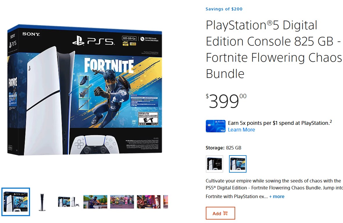 如果你前往 PlayStation 官方商店,你会发现PS5 超薄数字版--《堡垒之夜 》"乱花渐欲迷人眼 "套装以超低折扣价上市。在此之前,该套装的售价为 599 美元,但索尼已将价格砍掉 200 美元,降至 399 美元。在涨价之前,这款机型的售价为 499 美元,因此你仍能以比旧标准价格低 100 美元的价格买到它。