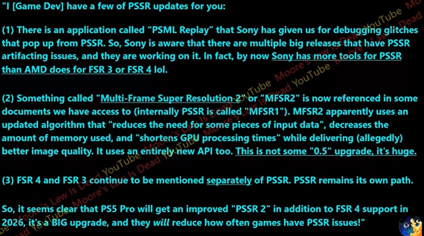 摩尔定律已死》(Moore's Law Is Dead)是第一个在 PS5 Pro 上市前详细披露 PlayStation 光谱超分辨率(PSSR)的泄密者。2025 年 5 月,该泄密者报道称索尼正在开发 PSSR2,以利用更少的资源实现更好的图像质量。现在,MLID 又声称了一些有关 PSSR2 的细节。