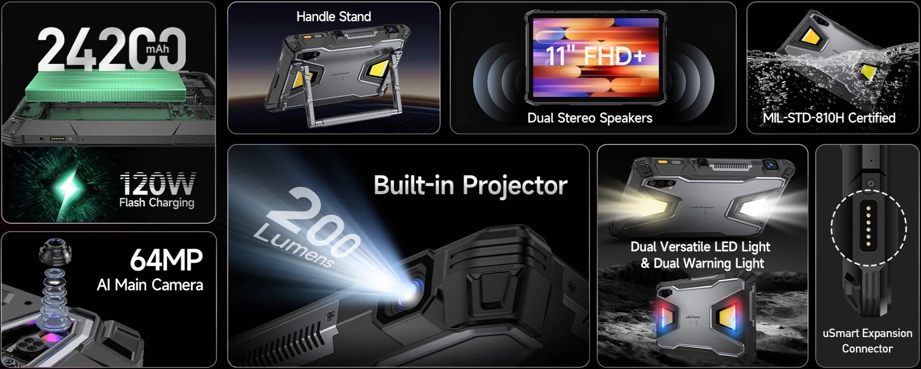 Android 平板电脑还配备了 200 流明自动对焦投影仪,向上投射角度为 26°。它的 102 分贝立体声扬声器适合户外使用。在拍照方面,Ulefone Armor Pad 5 Ultra 配备了 6400 万像素主摄像头和 6400 万像素夜视摄像头。自拍方面,它采用了 3200 万像素摄像头。