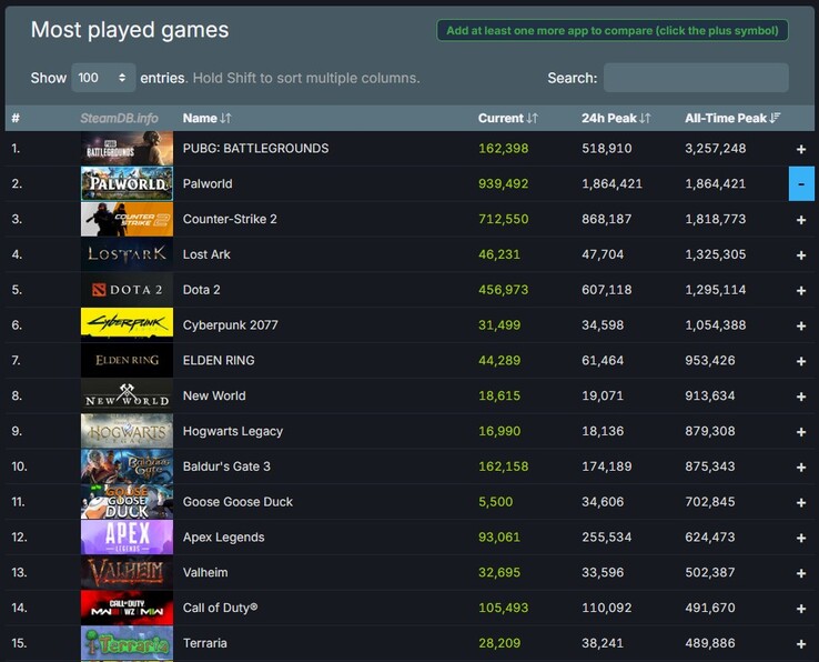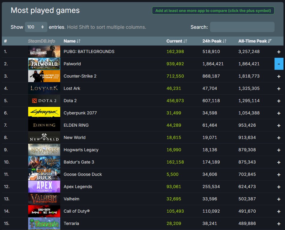 随着 10%的早期接入启动折扣进入最后一天,《Palworld》在 Steam 的历史人气排行榜上已经超过了《反恐精英 2》。在 Steam 的历史人气排名中遥遥领先,该排名基于 24 小时内同时在线玩家的最大数量。值得一提的是,虽然《Palworld》获得了第二名的成绩,但其 24 小时峰值也相当有趣。