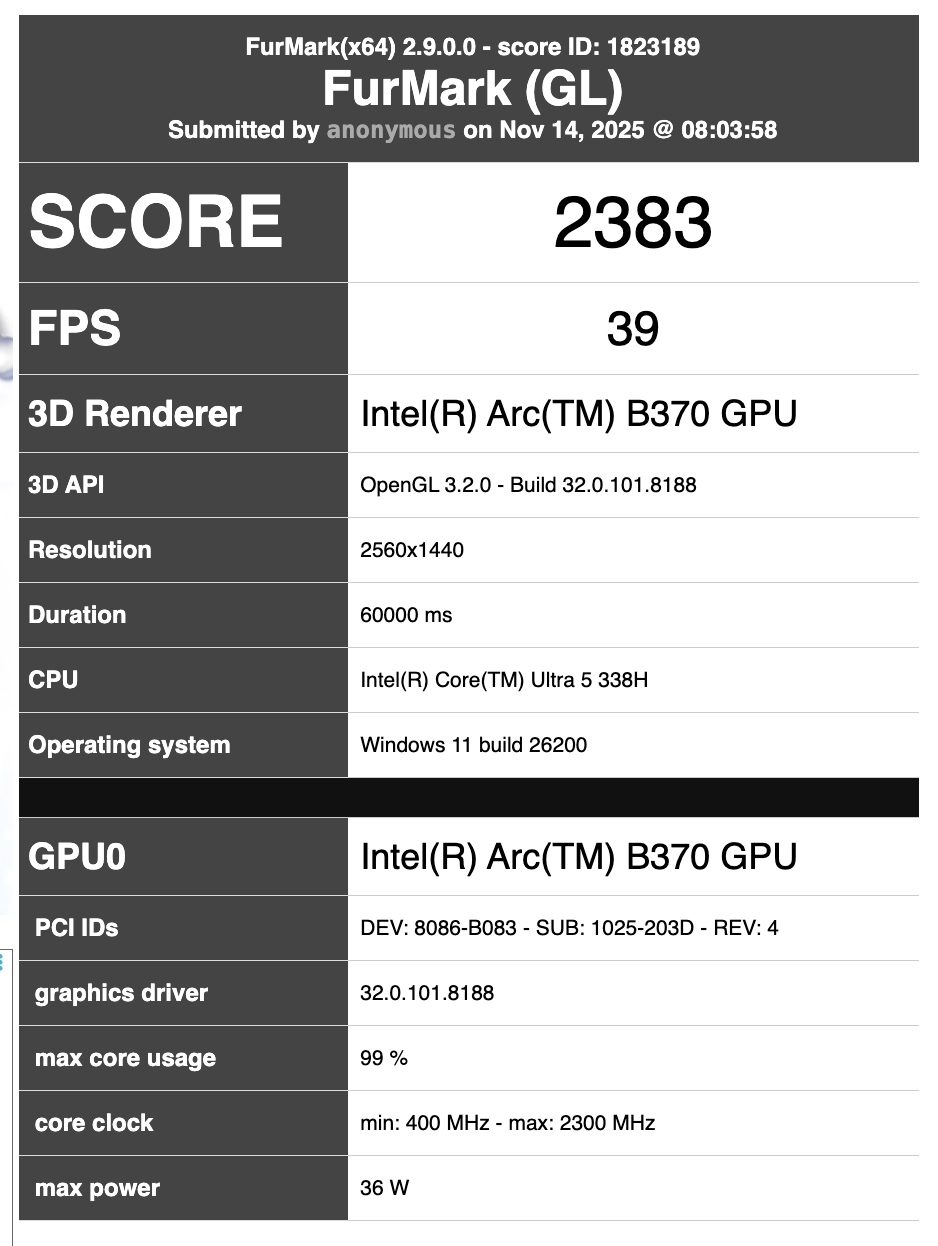 为此,下面转载的 FurMark 列表证实,该基准测试是在搭载 Core Ultra 5 338H 的设备上运行的,分辨率与之前发布的所有 OneXPlayer X1 版本相同。因此,该基准测试很可能与最近在 Geekbench 上发现的 Panther Lake 手持设备有关。