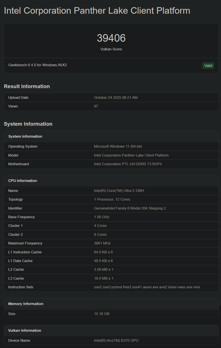 Core Ultra 5 338H 出现在Geekbench 上。 配备了前所未有的 iGPU:Arc B370。它的名字有点名不副实,因为 B 意味着它基于 Xe2 Battlemage 架构,而不是 Xe3 Alchemist。或者说,这很可能是 Geekbench 错误识别了显然是预生产笔记本电脑的 GPU。