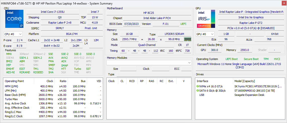 目前惠普Pavilion Plus 14 的配置基于 英特尔酷睿 i7-1355U并配备 16 GB LPDDR5x 内存和 1 TB PCIe NVMe 存储。