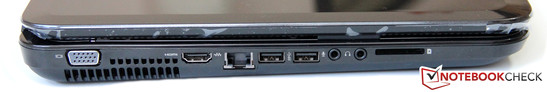 In addition to the identical chassis, the port selection of our test system holds no surprises in store when compared to other g7 models. The buyer gets 2x USB 3.0 and one additional USB 2.0 port. For a fairly large multimedia notebook the port selection is certainly not overwhelming, but nonetheless adequate. Most users will be perfectly happy with aforementioned ports, the display ports (VGA and HDMI), and the usual standard fare of Kensington lock slot and headphone / microphone jacks.