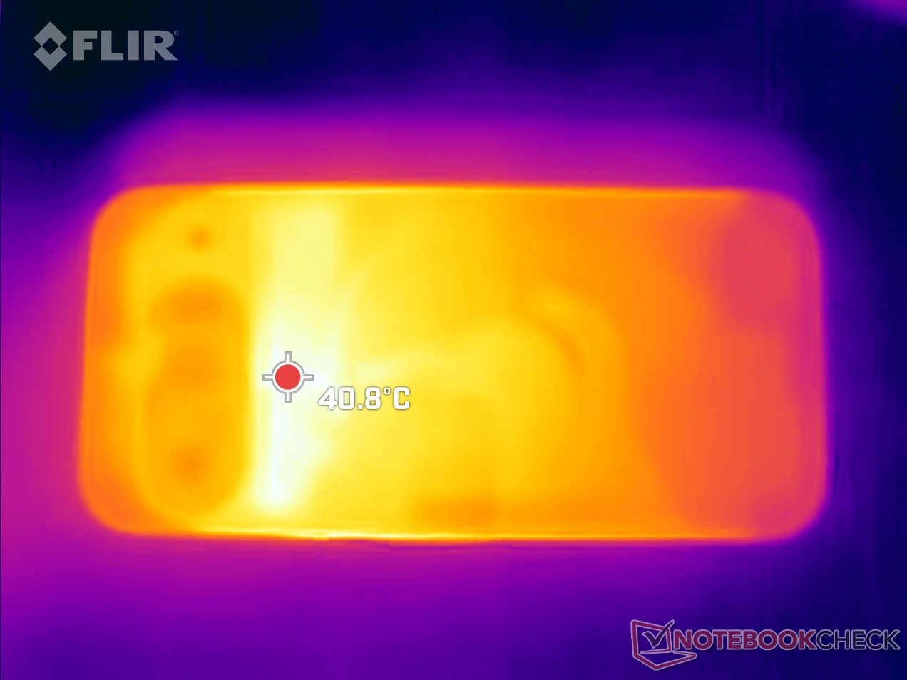 (±) The maximum temperature on the upper side is 40.6 °C / 105 F, compared to the average of 35.2 °C / 95 F, ranging from 21.9 to 247 °C for the class Smartphone.