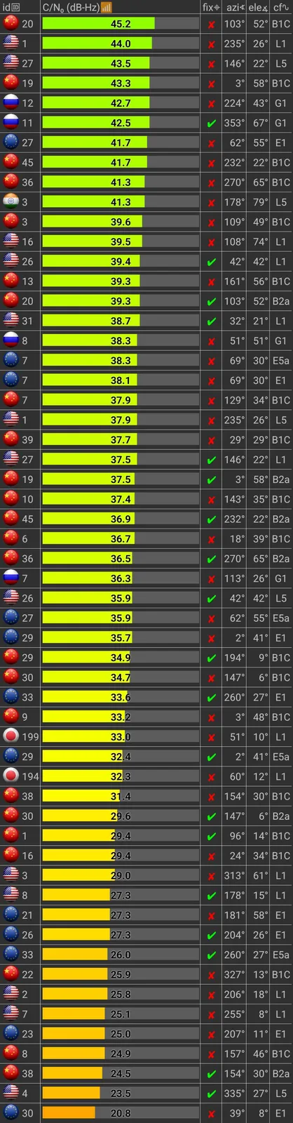 Pixel 10 提供广泛的卫星导航支持,包括 L1+L5 双频 GPS、GLONASS(L1/G1)、Galileo(E1+E5a)、北斗(B1C+B2a)、QZSS(L1+L5)和 NavIC(IRNSS L5)。