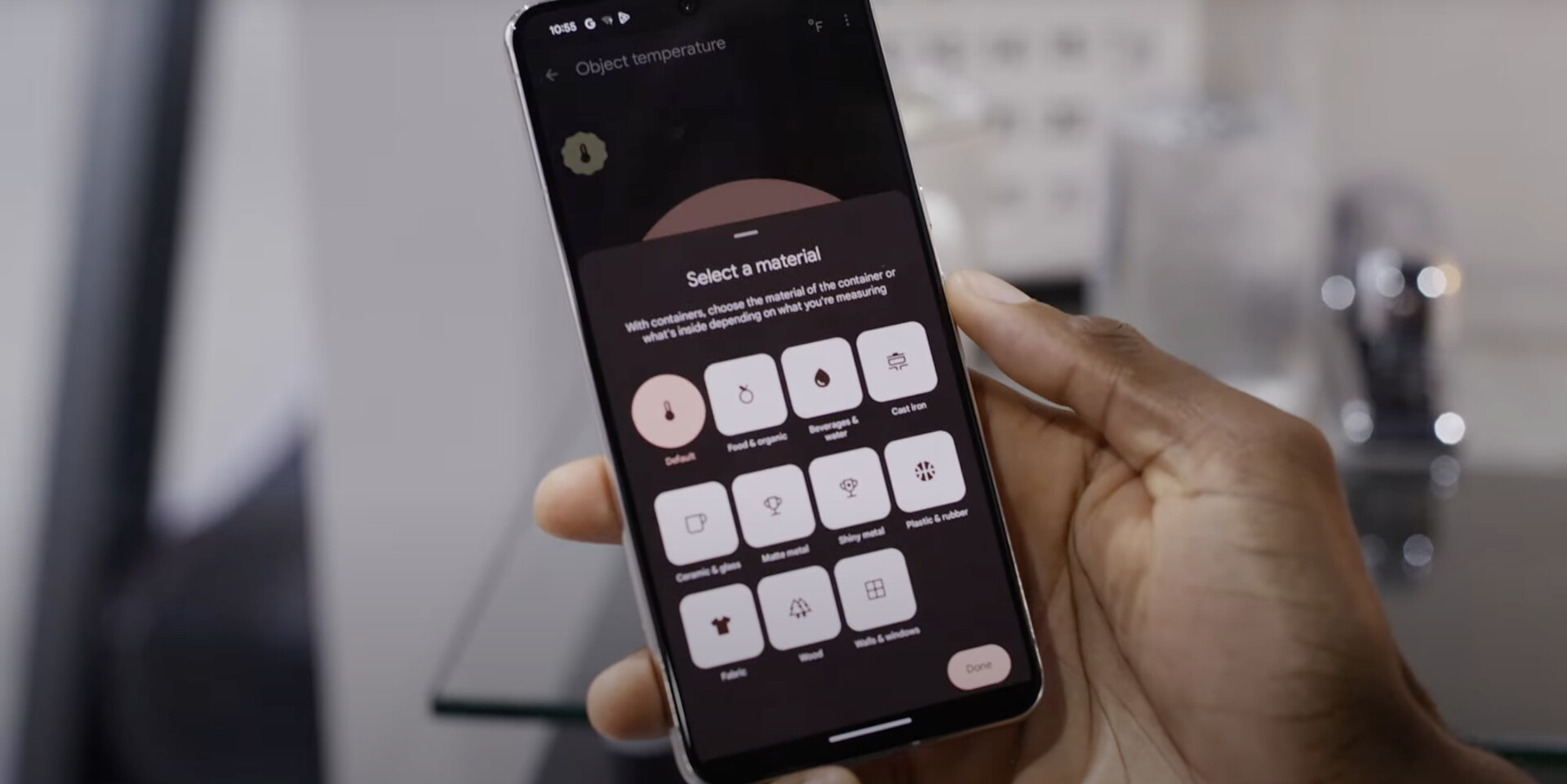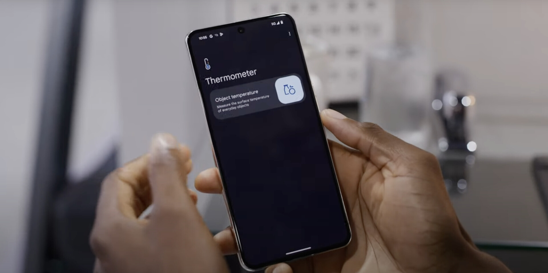 虽然这些功能有效地改善了 Pixel 的使用体验,但在温度传感器却被孤立在一个新的温度计应用程序中。根据 9to5Google 和 MKBHD 的报道,当物体距离相机栏 5 厘米以内时,传感器的效果最佳。此外,该传感器仅适用于-20 °C到150 °C之间的温度。