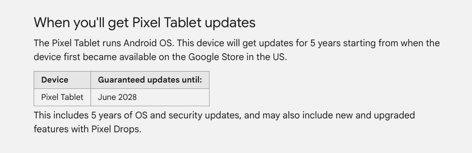 谷歌 Pixel 平板电脑于 2023 年 6 月推出,Android 13。最初,谷歌承诺在 2026 年 6 月之前只提供三个主要的Android 更新和功能更新,不过 Pixel 平板电脑应该在五年内都会收到安全补丁。现在,谷歌在其支持网站上确认Pixel 平板电脑将在五年内接受操作系统更新。