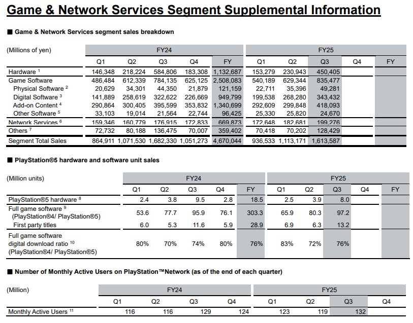 该公司还报告称,截至 2025 年 12 月 31 日,PlayStation 网络的月活跃用户为 1.32 亿。这一数字比上一财年同期增加了 300 万。