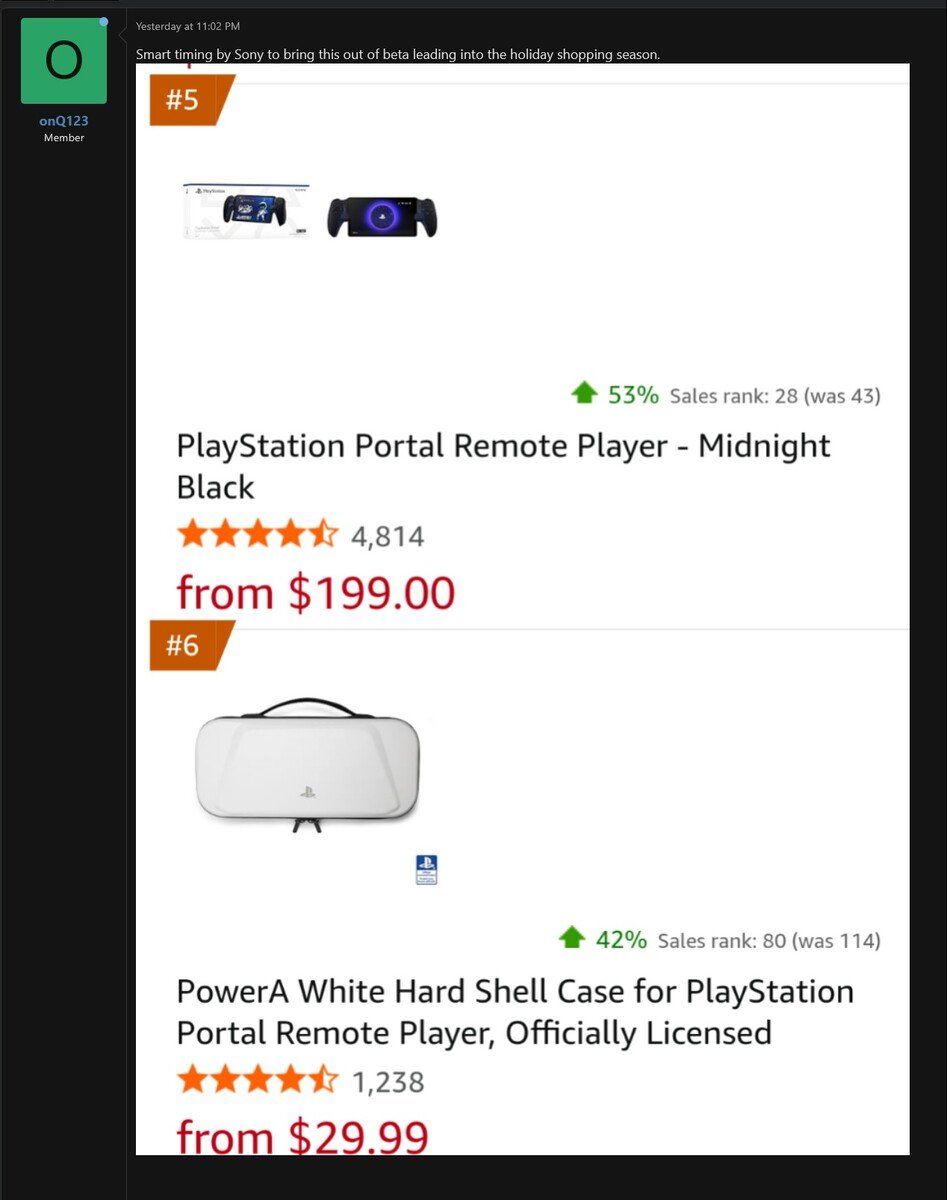 随着附加价值的增加,索尼移动设备 199.99 美元的建议零售价看起来更具竞争力。在NeoGaf 论坛上onQ123注意到,Portal在亚马逊视频游戏排行榜上的排名从第43位跃升至第28位。PlayStation Portal 的必备配件(如便携包)也很抢手。