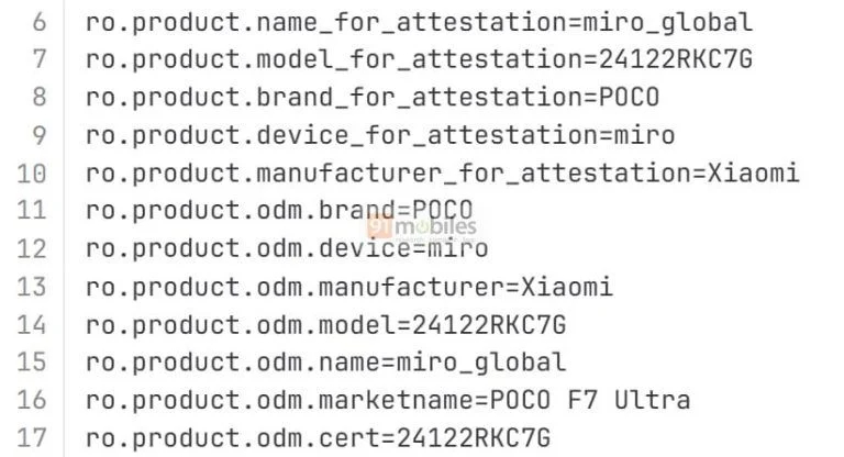 不出所料,固件将 "Poco F7 Ultra "链接到了型号 "24122RKC7G"。代码片段还提到了 Poco F7 Ultra 的代号 "miro "和 "miro_global",强调它是另一款设备的变体。假设 Poco F7 Ultra 完全继承了红米 K80 Pro 的设计,那么它应该会配备骁龙 8 Elite 芯片组和其他硬件,如 6,000 毫安时电池和 Light Hunter 800 主摄像头。请参阅 我们的红米 K80 Pro 发布文章了解 Poco F7 Ultra 在今年晚些时候亮相时可能会有的更多细节。